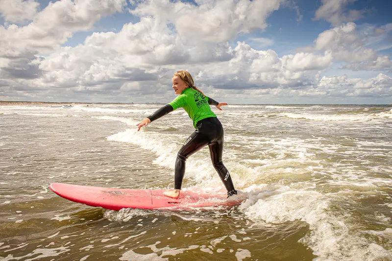 Ervaar de gezonde en sportieve uitdaging van golfsurfen! In onze 2 uur durende lessen leer je stap voor stap ‘down the line’ surfen, inclusief wetsuit en surfboard.
